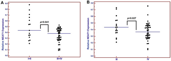 Differences in the relative expression of NEAT1 levels between groups of patients with (A) different tumor (T) staging; (B) locally advanced or advanced stages of LC according to the TNM. Abbreviations: I—T1 stage; II—T2 stage; III—T3 stage; IV—T4 stage.