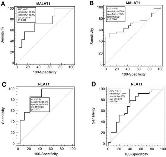 Only NEAT1 demonstrated diagnostic accuracy in distinguishing between patients based on the presence of anemia, with 85.71% sensitivity and 78.43% specificity (AUC = 0.84; cut-off > 0.28; p < 0.001) (Figure 3C). Additionally, NEAT1 was effective in discriminating between patients with liver failure, showing 78.95% sensitivity and 60% specificity (AUC = 0.71; cut-off > 0.20; p < 0.006) (Figure 3D). A combined analysis of NEAT1 and MALAT1 did not improve the diagnostic accuracy of the test.