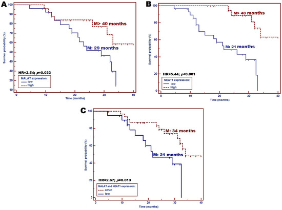 All patients enrolled in this study were followed up for 40 months. The incidence of death during the follow-up period was 37.1% (26/70 patients). The univariate survival analysis (Kaplan–Meier log-rank test) showed that patients with low MALAT1 expression had significantly shorter median OS compared to those with high MALAT1 expression (median OS: 29 months vs. >40 months; HR = 2.54; p = 0.033) (Figure 4A). Moreover, patients with low NEAT1 expression had more than a 5-fold higher risk of early death compared to other patients (median OS: 21 months vs. >40 months; HR = 5.44; p = 0.001) (Figure 4B). Additionally, the simultaneous presence of low MALAT1 and NEAT1 expression was significantly associated with about a 2.6-fold higher risk of OS reduction compared to patients with other expression variants (median OS: 21 months vs. 34 months; HR = 2.67; p = 0.013) (Figure 4C). The multivariate survival analysis (Cox proportional hazards model) revealed that low NEAT1 expression was an unfavorable independent factor affecting patient survival (HR = 5.88; p = 0.004).