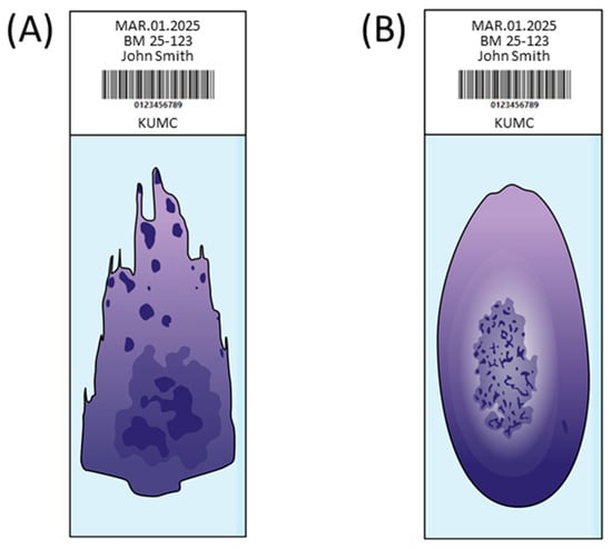 Illustration of bone marrow (BM) aspirate smears. The label contains fabricated information as an example. (A) Wedge-spread smear. A small drop of BM particles is placed 1 cm from the slide’s edge. A spreader at a 30-degree angle is used to drag the aspirate forward, creating a smear of 3–5 cm in length. (B) Crush technique smear. BM particles are placed in the center of the slide. A second slide, perpendicular to the first, is gently pressed and pulled apart to create the smear.