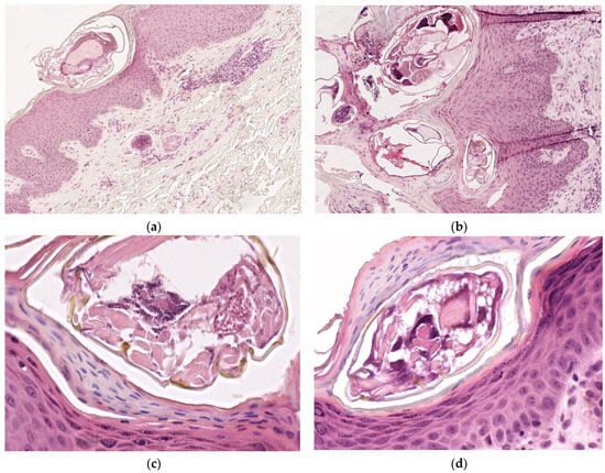 Microscopic examination on Hematoxylin–Eosin-stained slides: (a) Sarcoptes scabiei mite in stratum corneum, ob. 10×; (b) intracorneal mites, eggshells, and fecal deposits (scybala), ob. 10×; (c,d): oval shaped mites of 0.2 mm length and exoskeleton with striations, ob. 40×.
