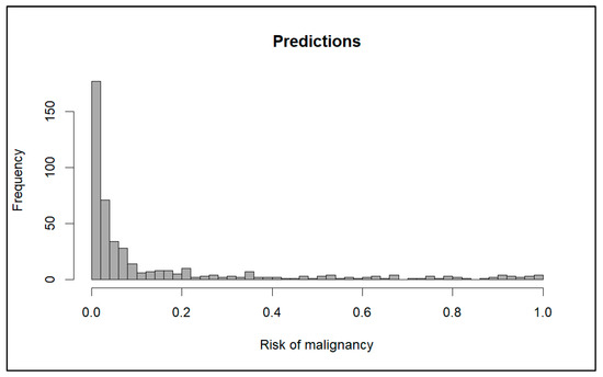 Figure 1 shows the distribution of the probabilities of malignancy predicted by the model. The median risk predicted was 3.33% (IQR 13.62%), and the mean risk was 14.73% (standard deviation 24.60%).