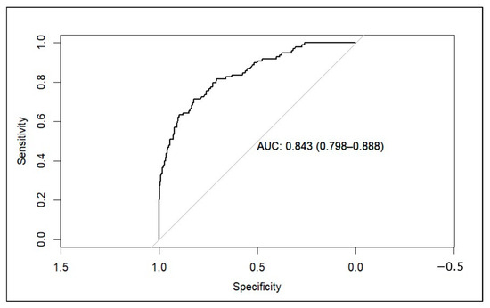 As for the discrimination performance, the concordance (c) statistic was 0.84 (95% CI 0.799–0.888), demonstrating good discrimination capacity. Additionally, an ROC curve was developed (Figure 3). Like the c-statistic, the area under the ROC was 0.84 (95% CI 0.799–0.888). The cutoff point with the smallest distance between the ROC plot and the point (0,1) was 0.0955. This means that we would consider a high risk of malignancy of the nodule when the model predicts a probability of 9.55% or higher. With this cutoff point, we obtain a sensitivity of 71.43% and a specificity of 82.35%. Selecting other cutoff points could maximize sensitivity. For example, with a threshold of 4.94%, the sensitivity rises to 80.61%, but specificity decreases to 70.86%.
