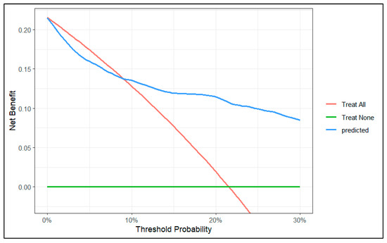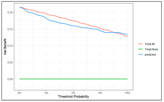To evaluate the clinical utility of the predictive model, we conducted a decision curve analysis. We created two decision curve graphs to assess the net benefit of using the model across different threshold values. Figure 4 presents the decision curve of the model for predicted risks between 0 and 30%. This graph shows that in the lower range of predicted risks, the model does not offer benefits compared to the strategy of treating all patients. In Figure 5, we zoomed in on the graph, focusing on risks between 0 and 10%. This graph shows that, from a threshold of 9%, the model outperforms the strategy of treating all patients.