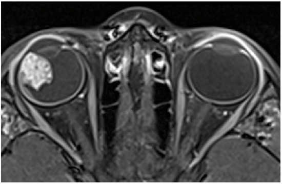 Magnetic Resonance Imaging (MRI) showed an irregular-surfaced ciliary body mass of heterogenic intensity, size of 13 × 11 × 14 mm (Figure 2) in the antero-lateral part of the right eye, with a heterogenous enhancement pattern. No scleral or extrabulbar invasion was revealed. Comprehensive additional examinations, including abdomen ultrasonography, chest radiograph, and blood analyses, revealed no additional abnormalities.
