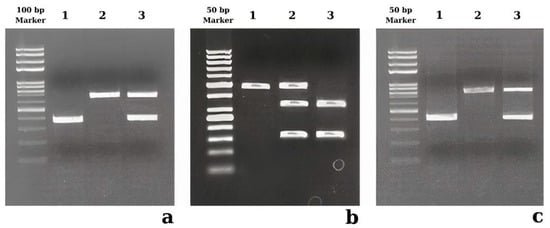 The restriction enzyme patterns of ACE rs4646994 (a), PPRGC1A rs8192678 (b), and ACTN3 rs1815739 (c) polymorphisms. (a) The first lane is a 100 bp size marker, lane 1 is del/del (homozygous), lane 2 is ins/ins (homozygous), and lane 3 is ins/del (heterozygous). (b) The first lane is a 50 bp size marker, lane 1 is TT (homozygous), lane 2 is TC (heterozygous), and lane 3 is CC (homozygous). (c) The first lane is a 50 bp size marker, lane 1 is TT (homozygous), lane 2 is TC (heterozygous), and lane 3 is CC (homozygous).