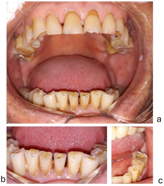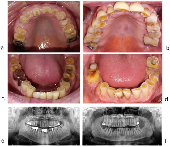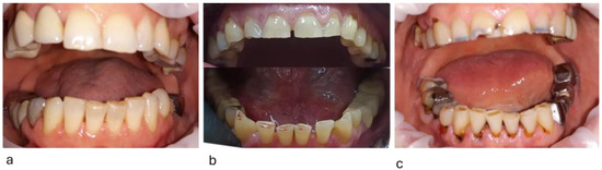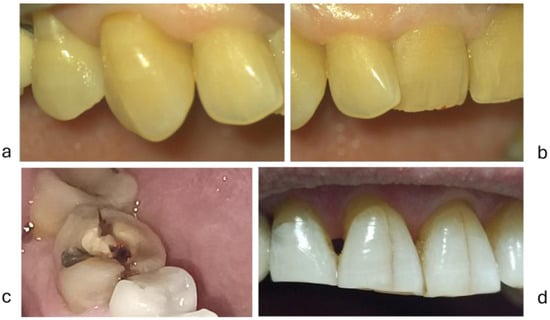 The diagnosis of dental fractures and the number of teeth with dental fractures (fractured cusps, fractured crowns, or vertical crown–root fractures) was established after dental history and clinical examination using criteria of the American Association of Endodontics [43,52,53]. Clinical aspects of fatigue fractures are presented in Figure 3.
