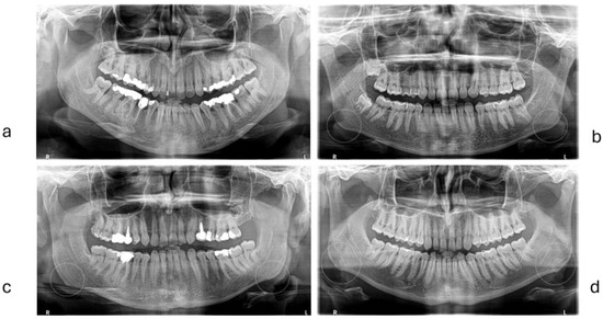Digital panoramic radiographs (orthopantomography) taken with Carestream CS 8100 3D (Carestream Dental LLC, Atlanta, GA, USA) were used to assess bone apposition at the mandible. Bone apposition was identified as a unilateral or bilateral change in the shape of the basal cortical bone at the mandibular angle and classified into four grades (0 = absent, 1 = minor, 2 = slight, and 3 = major) [47,48,56,57], as in Figure 6. The bone apposition score was computed as follows: without bone apposition (patients with scores 0 and/or 1 in both sides), moderate bone apposition (for patients with one angle without bone apposition, one angle with bone apposition 2 or 3), and high bone apposition (for patients with scores of 2 or 3 in both mandibular angles).