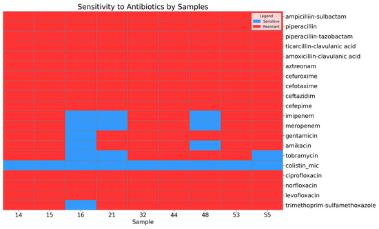 Heatmap showing the sensitivity and resistance of the A. baumannii isolates to antibiotics.