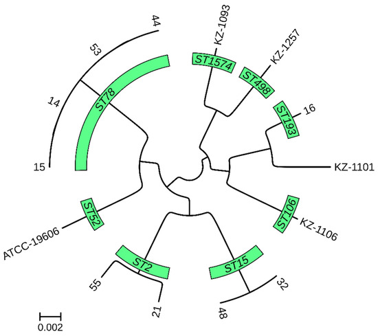 For comparative analysis, four isolates collected in Kazakhstan in 2016 were included: KZ-1106 (GenBank ID—JAUMSL000000000), KZ-1093 (JAJAWC000000000), KZ-1101 (JAPYKX000000000), and KZ-1257 (JALDNC000000000). The reference genome used for comparison was the strain ATCC-19606 (CP045110).