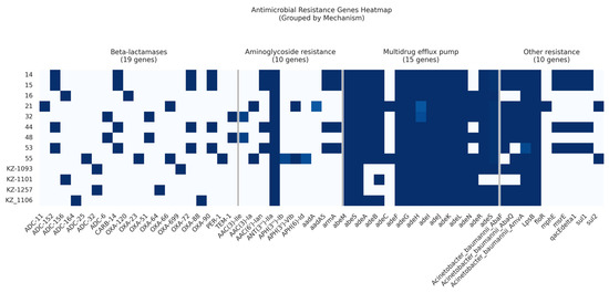 Heatmap showing the presence or absence of acquired AMR genes within the A. baumannii draft genomes.
