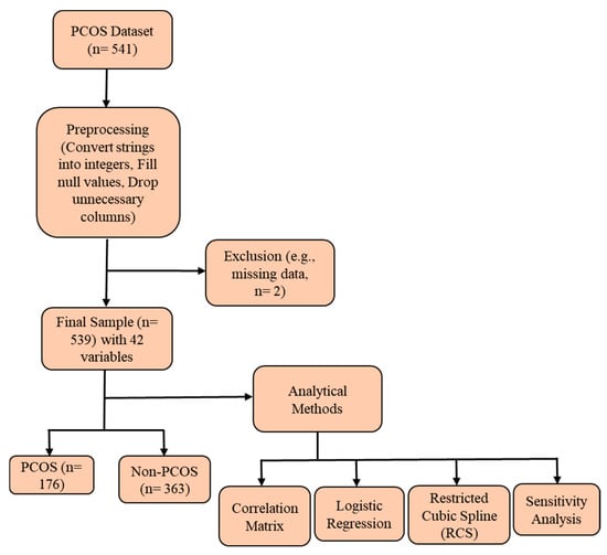 For our study, we utilized the PCOS dataset sourced from Kaggle, which initially included 541 participants. After applying exclusion criteria, such as missing data, 2 participants were excluded, resulting in a final sample size of 539 participants. The dataset comprises 42 variables relevant to the diagnosis and characterization of PCOS. The study population was divided into two groups based on PCOS diagnosis: Confirmed PCOS: 176 participants and Non-PCOS: 363 participants (Figure 1). These groups were analyzed to explore various clinical, physical, and reproductive characteristics associated with PCOS, allowing for a comprehensive examination of the condition and its impacts. The dataset includes information on the number of pregnancies, complications, infertility status, and a variable titled ’Pregnant (%)’, which indicates whether the participant has ever been pregnant at any point in their lifetime, rather than their current pregnancy status. While the dataset provides valuable clinical and reproductive details, it does not include information on the specific geographic region, ethnic background, or clinical setting from which participants were recruited. This is a limitation that should be considered when interpreting the findings, as PCOS prevalence and characteristics may vary across populations.