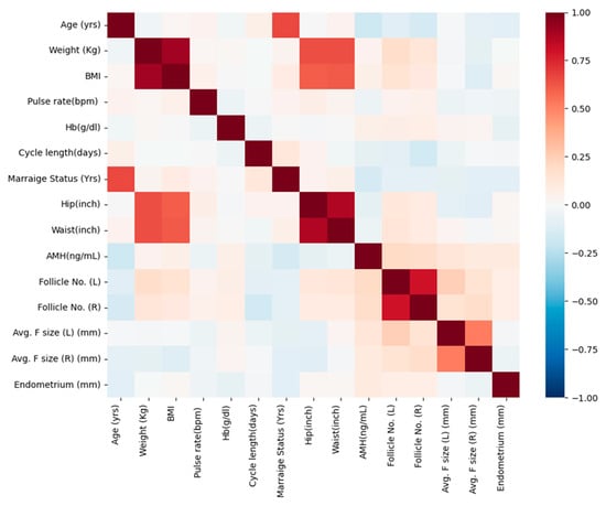 Correlation analysis was conducted to explore key relationships among significant continuous variables and to assess potential multicollinearity before performing multivariable logistic regression. Our findings reveal several meaningful associations with clinical implications (Figure 2). A strong positive correlation was observed between weight and BMI (r = 0.901), reinforcing the well-established relationship between body weight and obesity-related parameters. Similarly, waist and hip measurements exhibited a strong correlation (r = 0.874), which aligns with their role in assessing body fat distribution, a crucial factor in metabolic health. In the context of ovarian function, the number of follicles in the left and right ovaries showed a strong positive association (r = 0.799), reflecting a consistent pattern of follicular development across both ovaries. While AMH levels demonstrated a weak positive correlation with follicle count (r = 0.200 for Follicle No. (L) and r = 0.183 for Follicle No. (R)), this suggests that AMH may serve as an indicator of ovarian reserve, though its predictive value should be considered alongside other clinical parameters. A weak negative correlation was observed between AMH levels and menstrual cycle length (r = −0.073), hinting at a possible link between ovarian reserve and menstrual cycle regularity. Additionally, endometrial thickness exhibited slight positive correlations with follicle count (Follicle No. (L) (r = 0.076) and Follicle No. (R) (r = 0.075)), which could have implications for endometrial receptivity and overall reproductive potential. By focusing on these relationships, our analysis provides insights into the interplay between body composition, ovarian reserve markers, and reproductive function.