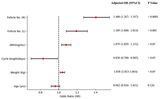 Forest plot of multivariable logistic regression. AMH: Anti-Mullerian Hormone; Follicle No. (L): Follicle No. of Left ovary; Follicle No. (R): Follicle No. of Right ovary. The red circle is adjusted OR.