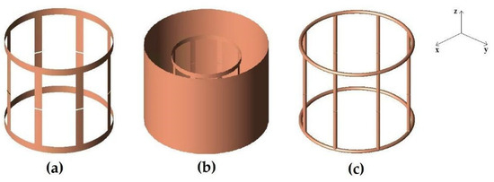 FDTD models of the simulated coils. (a) strip birdcage coil (8 legs, 11 cm length, 13.4 cm diameter) constituted by a 1 cm-wide strip. (b) strip birdcage coil as in (a) with a 16 cm diameter shield. (c) wire birdcage coil (8 legs, 11 cm length, 14 cm diameter) constituted by a 2.23 mm-radius wire.