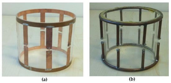- Giovannetti, G.; Francesconi, R.; Landini, L.; Santarelli, M.F.; Positano, V.; Viti, V.; Benassi, A. Conductor Geometry and Capacitor Quality for Performance Optimization of Low-Frequency Birdcage Coils. Concepts Magn. Reson. Part B Magn. Reson. Eng. 2004, 20B, 9–16. [Google Scholar] [CrossRef]
