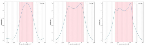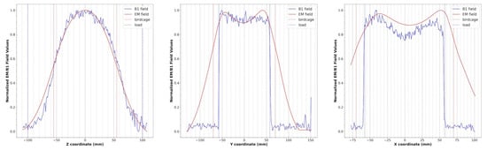 The magnetic field modulus profiles along three straight lines passing through the birdcage center were estimated for the x, y, and z axes (Figure 5). In particular, the blue lines are obtained by extracting the profiles along each axis in the cylindrical phantom acquisition, while the red lines refer to the simulated magnetic field. Both profiles were normalized with respect to the maximum intensity of the B1 field and simulated magnetic field, respectively. The birdcage and phantom sizes are shown in the same figure as red and blue dotted lines, respectively.