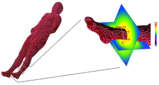 With respect to magnetostatic and MoM simulations, the FDTD method is very attractive because complex structures, such as parts of the human body, can be incorporated into the computational space, permitting us to obtain a biological sample–coil interaction model. To exploit this inherent advantage of FDTD simulation, we predict the RF field generated by a coil in the presence of an anatomical target (i.e., the calf) (Figure 6). As shown in Figure 7, the numerical simulator allowed us to predict the field variations induced by the anatomical load. We carried out comparison of the field shape in Figure 7 with the one obtained in the presence of a symmetric load (Figure 6). A field asymmetry induced by the asymmetric load can be noticed in the x and y planes. Field prediction could represent an important advantage in the management of MR experiments, especially in the research field, as scanner time is a costly resource that must be optimized. As the efficiency of RF coils is a key aspect in low-field MR imaging, if an image quality issue appears during a scan, it may derail the entire planned session, resulting in expensive “wasted” scan time. Predicting the RF coils’ performance prior to the session could allow us to solve this problem.