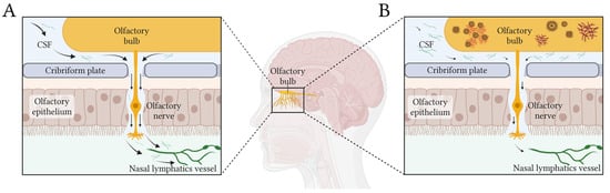 - Nasal pathway is the main CSF egress from the brain. CSF is primarily cleared along olfactory nerves that traverse the cribriform plate, draining into lymphatic vessels in the nasal mucosa []. De Leon and colleagues demonstrated, using dynamic PET, that, as in other mammals, human nasal turbinates are part of the CSF egress system []. They also observed that such clearance measures were 66% lower in AD patients. Using a different technique, serial MRI after an intrathecal contrast injection, Zhou et al. found concordant results []. They observed drainage of CSF to the turbinates via the cribriform plate along the olfactory nerve, this being the main egress pathway. Moreover, clearance function through the peri-olfactory inferior turbinate pathway was diminished with aging and was associated with cognitive function and reported sleep quality []. Figure 1 depicts the physiological CSF egress through the perineural olfactory pathway (Figure 1A) and the pathological protein aggregation associated with diminished clearance (Figure 1B).Figure 1. Simplified scheme of CSF egress through the periolfactory pathway. Black arrows show the CSF flow in healthy (A) and pathological (B) conditions. In panel (B), the diminished flow of CSF produced by glymphatic dysfunction would generate stagnation of solutes and abnormal accumulation of proteins in the olfactory bulb and related structures. Created in BioRender https://BioRender.com/l91w249.