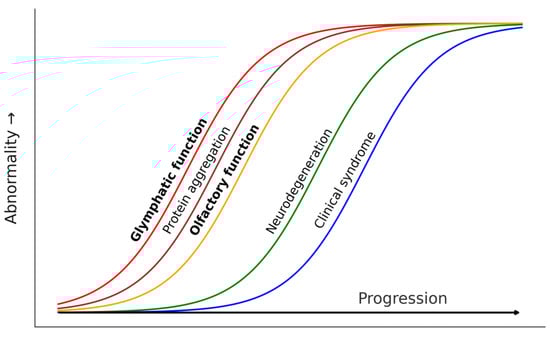 - Glymphatic failure seems to be a very early event in neurodegenerative diseases. Recent evidence suggested that glymphatic function is affected very early in AD. Using diffusion tensor imaging (DTI) along perivascular spaces (ALPS), a neuroimaging proxy of glymphatic function, two large longitudinal studies found that the ALPS index becomes abnormal in individuals with subjective cognitive decline (SCD), before objective cognitive impairment can be detected [,]. Moreover, the lower ALPS index predicts accelerated Aβ PET burden and AD signature ROI thinning, higher risk of amyloid-positive transition, and faster cognitive decline []. Based on such evidence, Huang et al. proposed a hypothetical cascade model of pathological events in AD, in which reduction in the ALPS index would be the first biomarker to change. The evidence in LBD is similar. Using the DTI-ALPS index as well, Bae et al. found that glymphatic function was diminished in RBD patients and that the lower ALPS index predicted phenoconversion to PD []. Accordingly, they concluded that glymphatic impairment is presumed to start at the preclinical stage of PD.
