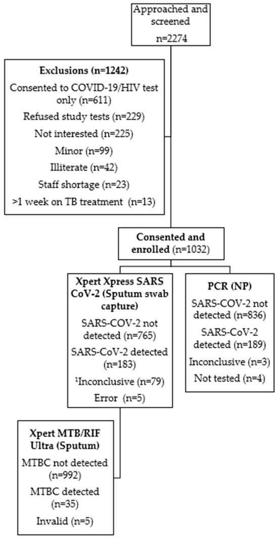 We previously conducted a small pilot study demonstrating the feasibility of detecting both SARS-CoV-2 and Mycobacterium tuberculosis complex (MTBC) from a single sputum sample []. To build on these findings, this larger study aimed to validate the approach in a broader population, including both symptomatic and asymptomatic individuals at primary healthcare clinics (PHCs) who would have otherwise only undergone routine SARS-CoV-2 testing. We assessed the performance of the Xpert Xpress SARS-CoV-2 (Xpress) assay (Cepheid, Sunnyvale, CA, USA) using a sputum swab capture method by comparing the results with routine SARS-CoV-2 testing and determining the prevalence of TB, rifampicin (RIF)-resistant TB and TB–COVID-19 co-infection in the study population.