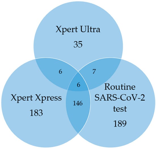 Venn diagram illustrating the number of participants who tested positive for Mycobacterium tuberculosis complex (MTBC) and/or SARS-CoV-2 using Xpert MTB/RIF Ultra, Xpert Xpress SARS-CoV-2 and routine SARS-CoV-2 PCR testing. Xpert Xpress SARS-CoV-2 was used to detect SARS-CoV-2 on sputum swabs, while Xpert MTB/RIF Ultra was used to detect MTBC and rifampicin resistance-associated mutations in sputum. Routine SARS-CoV-2 testing was performed on nasopharyngeal swabs. The numbers represent the distribution of positive results among the three testing methods. The overlapping areas indicate participants with concordant results across multiple methods.