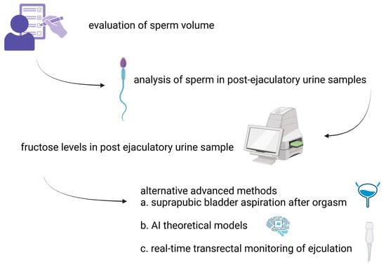 Diagnosing RE is generally straightforward and involves evaluating the patient’s medical history along with laboratory tests. Patients often report either a reduced semen volume (partial RE) or a complete absence of ejaculation (complete RE) after orgasm. The occurrence of aspermia or hypospermia accompanied by oligozoospermia should prompt the consideration of RE [33]. Additionally, seminal plasma is typically clear in appearance, and its pH level can serve as a useful diagnostic indicator.