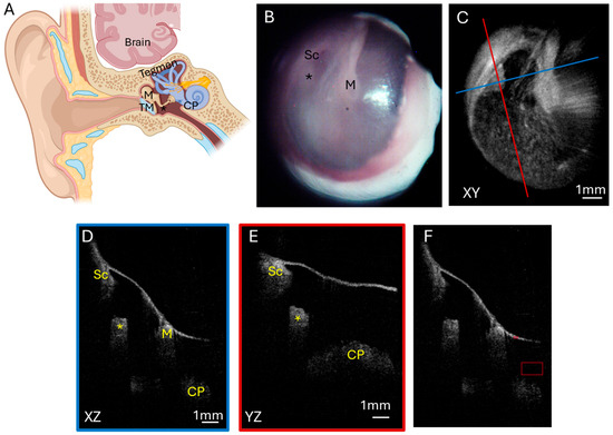 Normal ear. (A) Illustration of a normal ear showing the tympanic membrane, ossicular chain, and inner ear. The tegmen is bone that separates the ear from the brain temporal lobe sitting above the ear. Endoscopic view of the right tympanic membrane (B) of a patient with a normal ear exam. OCT enface XY view (C) of the tympanic membrane, with the blue line representing the plane leading to the middle ear for the cross-sectional XZ (D) view (blue box) and the red line representing the plane leading to the middle ear for the cross-sectional YZ (E) view (red box) showing the middle ear ossicles and cochlear promontory. (F) Quantification of pixel intensity in the mesotympanum (larger red box) in comparison to tympanic membrane pixel intensity (smaller red box). TM, tympanic membrane; M, malleus; Sc, scutum; *, incudostapedial joint; CP, cochlear promontory.