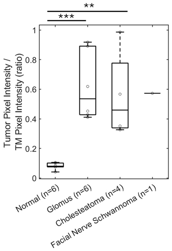 Statistical analysis of the mean pixel intensity in the region of interest with the middle ear masses, normalized to the mean pixel intensity of the tympanic membrane is shown in Figure 6. Glomus tumors, cholesteatomas, and the facial nerve schwannoma all had similar values, demonstrating that OCT can detect the density of the soft tissue mass, compared to the normal middle ear filled with air. The mean pixel intensity ratio was 0.620 ± 0.095 (mean ± standard error) for glomus tumors (n = 6), 0.558 ± 0.153 for cholesteatomas (n = 4), and 0.573 for facial nerve schwannoma (n = 1), which were not significantly different (p = 0.72, t-test between glomus tumor and cholesteatoma). However, there was a statistically significant difference between the mean pixel intensity ratio of 0.082 ± 0.008 for the group of normal ears (n = 6) and the group of glomus tumors (p < 0.001, t-test) or cholesteatomas (p < 0.01, t-test). Therefore, volumetric OCT alone can demonstrate the presence of a soft tissue mass in the middle ear but not necessarily the type of middle ear mass.