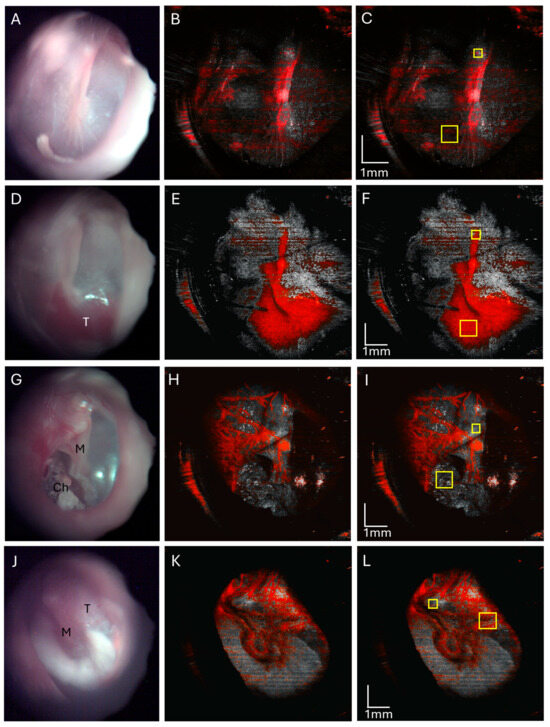 OCT angiography of a normal ear (A–C), ear with glomus tumor (D–F), ear with cholesteatoma (G–I), and facial nerve schwannoma (J–L). Normal right ear endoscopic view (A) with corresponding OCT angiography (B) showing normal tympanic vasculature over the area of the malleus, and quantification of the angiography signal (C) in the mesotympanum (large yellow box) normalized to the malleus lateral process (small yellow box). Endoscopic view of the right tympanic membrane of a glomus jugulare tumor (D) and an OCT angiography overlay (E) with a greatly increased angiographic signal in the tumor area, and quantification of the angiography signal (F) in the mesotympanic region of tumor (large yellow box) normalized to the malleus lateral process (small yellow box). Endoscopic view of right ear mesotympanic cholesteatoma (G) with an OCT angiography signal overlay (H) of this mesotympanic cholesteatoma showing the absence of the angiographic signal in the cholesteatoma, and quantification of the angiography signal (I) in mesotympanic cholesteatoma (large yellow box) normalized to the malleus lateral process (small yellow box). Endoscopic view of left ear facial nerve schwannoma (J) with an OCT angiography overlay (H) showing vascularity but less than that of glomus tumors, and quantification of the angiography signal intensity (I) (large yellow box) normalized to the malleus lateral process (small yellow box). M, malleus; T, tumor; Ch, cholesteatoma.