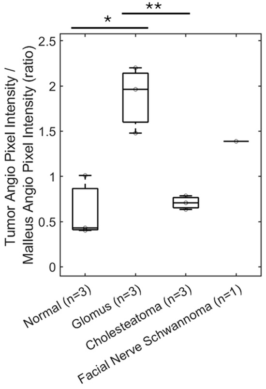 OCT can demonstrate vascularity. Quantification of OCT angiography pixel intensity in the region of the glomus tumor (n = 3) shows a significant—almost three-fold—increase compared with cholesteatoma (n = 3) or a similar area of a normal ear (n = 3). Facial nerve schwannoma has some vascularity but not to the extent of glomus tumors. * p < 0.05, ** p < 0.01.
