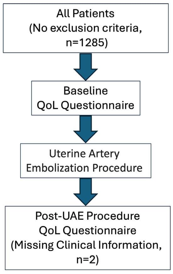 Uterine fibroids (leiomyomata uteri) are the most common benign tumor of the uterus, occurring in approximately 20–50% of women of reproductive age [1,2]. Race, age, family history, time since last birth, premenopausal state, hypertension, and diet comprise the known risk factors for fibroid disease [1,2,3,4]. The incidence is significantly higher for Black (80%) compared to Caucasian (70%) women, with nearly a quarter of Black women between the ages of 18 and 30 affected by fibroids (vs. 6% of Caucasian women), climbing to 60% by age 35 [3,4]. Although fibroids are benign tumors, they are responsible for symptoms in approximately half of women with fibroids, including pelvic pain, bulk symptoms of pressure, bleeding both during (menorrhagia) and between (metrorrhagia) menstrual cycles that can cause anemia, day- and nighttime urinary frequency, fatigue, dyspareunia, and infertility [5,6,7,8,9,10]. Although such symptoms may be quite debilitating, prompting women to seek care for their fibroids, many women remain unaware of the health impact of their fibroid-specific symptoms, frequently leading to a long wait before definitive therapy is contemplated [5,6,7,8,9,10]. Treatment standards are typically surgical in nature and take the form of myomectomy, which spares the uterus but has been somewhat plagued by high recurrence rates, or hysterectomy, which some have criticized for being overused [5,6,7]. The emergence of image-guided therapies within the field of interventional radiology has led to the growing acceptance of uterine artery embolization (UAE) as an established therapy for fibroid disease because it leaves the uterus intact while causing involution or, in some instances, complete disappearance of the fibroids [11,12,13,14]. During the nearly 30 years of its existence and its availability to women, many clinical studies and published manuscripts have demonstrated UAE’s safety and efficacy, especially for symptomatic relief [11,12,13,14]. Yet, despite its growing acceptance, resistance to its wider use still exists because UAE is not considered to be a definitive therapy—as opposed to surgical treatments—and because concern about fibroid recurrence remains. Such arguments are largely responsible for the development of fibroid disease-specific quality of life (QoL) measures to determine the clinical success of UAE, especially given the negative impact of fibroid-related symptoms on physical and social activities, general quality of life, and work productivity [15,16]. To that end, the Uterine Fibroid Symptom and Health-Related Quality of Life (UFS-QoL) questionnaire was developed and validated to address such issues [15,16]. Several studies seemed to indicate the positive impact of UAE on patient quality of life (QoL), thereby favoring its use over other more invasive therapies [12,16,17,18]. As medicine is evolving towards outpatient care, which was accelerated by the Covid crisis, access to care has been facilitated and increased for patients, especially those in low socioeconomic urban areas, by the presence of dedicated outpatient facilities, such as ambulatory surgical centers (ASCs) and office-based labs (OBLs) [19]. Physicians working in OBLs are performing increasingly complex procedures for patients with peripheral artery and cardiac disease, as well as other conditions, such as fibroid disease, benign prostatic hypertrophy, and various cancers [19]. Thus, it is critical to study the effect of UAE on the QoL of patients suffering from fibroid disease treated in an outpatient setting, especially given the paucity of data that exists. Therefore, the purpose of our study was to assess the impact of UAE in women with fibroid disease treated in the largest OBL system in the United States on their QoL using the UFS-QoL questionnaire.