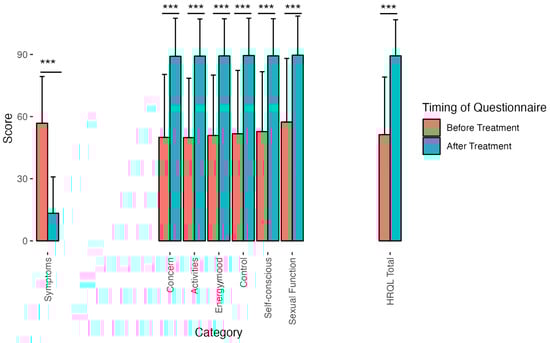 Analysis was performed using a dedicated, fibroid-specific, and validated quality of life (UFS-QoL) questionnaire that has been used in other studies [15,16,20,21,22], consisting of 37 questions about six QoL domains and clinical symptoms. Symptoms and measures of quality of life were compared from baseline to follow-up time points. In total, 8 questions measure clinical symptoms and 29 address health-related quality of life issues. The symptom questions consist of 5 ratings on a Likert scale from 1—not at all—to 5—a very great deal. The health-related QoL questions have a rating from 1 (none of the time) to 5 (all of the time). The 6 domains that constitute the QoL questions include concern, activities, energy/mood, control, self-consciousness, and sexual function [15,16,20,22]. There is an additional domain for overall QoL, referred to as health-related quality of life (HRQL).
