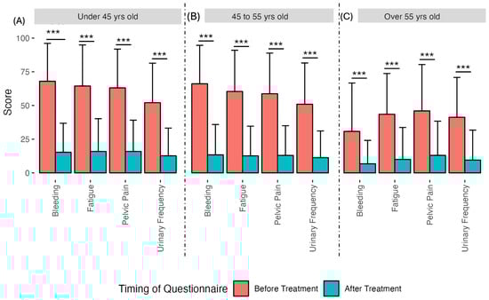 Various clinical symptoms before and after UAE by age group: less than 45 years of age (A), between 45 and 55 years of age (B) and over 55 years of age (C). As with Figure 4, at the baseline (before treatment), the over 55 age group had a better mean score in each clinical symptom category than the under 45 and 45–55 age groups. However, after treatment, the disparity between age groups decreased and lost its significance. (Triple asterisks indicate p-value < 0.001.)
