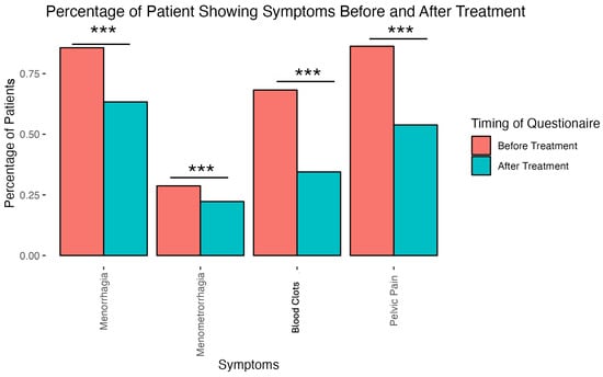 The presence or absence of clinical symptoms captured on the EMR in a binary fashion included menorrhagia, menometrorrhagia, blood clots, and pelvic pain. Resolution of these symptoms post-UAE was statistically significant (p < 0.001) (Figure 6).