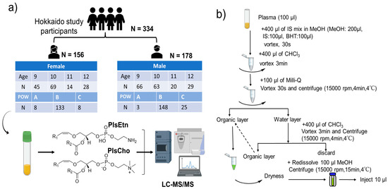 Pls in serum samples from female adolescents with and without pain were investigated by global lipidomics [13]. In another study, gas chromatography was applied to determine Pls in the red blood cells of neonates and 1–8-year-old children [14]. Liquid chromatography/tandem mass spectrometry (LC-MS/MS) is widely applied for the determination of Pls in human plasma samples due to its high sensitivity and selectivity [15,16]. A previous study showed that the concentration of Pls in human plasma was 0.5–13.6 µM [17]. Despite their clinical significance, their absolute levels in children’s plasma are not yet fully determined or have only been used in a limited sample size. As for our knowledge, no studies have been conducted to determine the concentration of Pls in preadolescent children of different ages, genders, and percentages of body weight (POW). In this study, we aim to analyze the absolute concentration of Pls in plasma samples collected from 334 preadolescent children (from 9 to 12 years old) of the Hokkaido study using targeted LC-MS/MS, as shown in Figure 1a [18,19,20,21]. Furthermore, in this paper, the variations in Pls by age, gender, and POW are discussed.