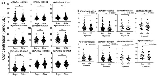 (a). Sex-dependent changes in plasmalogen concentrations in children’s plasma. (b). Sex- and age-dependent variations in PlsEtn 16:0/20:5 and PlsCho 16:0/20:5 concentrations in children’s plasma. (Wilcoxon test (€) and t-test (@); p-value: (ns: non-significant, p < 0.1 (#), p < 0.01 (*), p < 0.001 (***)).