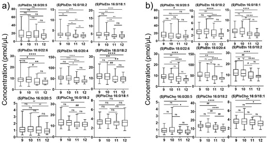 (a) Boxplot with min to max values for age-dependent changes in plasmalogen concentrations in boys’ plasma. (b) Boxplot with min to max values for age-dependent changes in plasmalogen concentrations in girls’ plasma (Kruskal–Wallis ($) and one-way ANOVA (¥) analysis; p-value: (ns: non-significant, p < 0.1 (#), p < 0.05 (##), p < 0.01 (*), p < 0.005 (**), p < 0.001 (***), p < 0.0005 (****)).