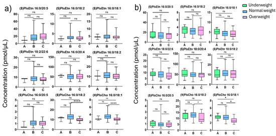 (a) Boxplot with min to max values for POW-dependent changes in plasmalogen concentrations in boys’ plasma. (b) Boxplot with min to max values for POW-dependent changes in plasmalogen concentrations in girls’ plasma (A: underweight; B: normal weight; C: overweight; Kruskal–Wallis ($) and one-way ANOVA (¥) analysis; p-value: (ns: non-significant, p < 0.1 (#), p < 0.01 (*), p < 0.0005 (****)).