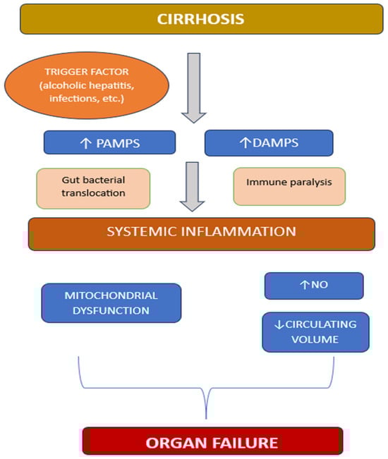 Even though the exact mechanism of ACLF syndrome is not completely understood yet, we all agree that systemic inflammation has a fundamental role in the development of ACLF. Alongside systemic inflammation there is an altered immune response characteristic for cirrhotic patients that also contributes to the ACLF process (Figure 1).
