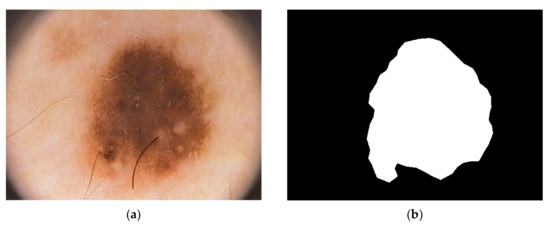 Melanoma cancer image IMD002 from PH2 Dataset images, (a) original RGB image (b) manual segmentation of melanoma known as a ground truth [40] (https://www.fc.up.pt/addi/ph2%20database.html, accessed on 17 February 2025).