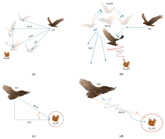 Figure 2a,b depict the exploring processes with expanded and narrowed scope, respectively. In addition, two different phases may be distinguished in the AO algorithm: the exploitation phase and the local search phase. The phase of expanded exploitation, characterized by gradual descent, is presented in Figure 2c. Narrowed exploitation is shown in Figure 2d.