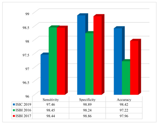 The suggested methodology achieved optimal performance concerning segmentation on the ISBI 2017 images. The outcomes for sensitivity and accuracy were most similar to those reported by Guo et al. [45], while specificity was more similar to that reported by [46].