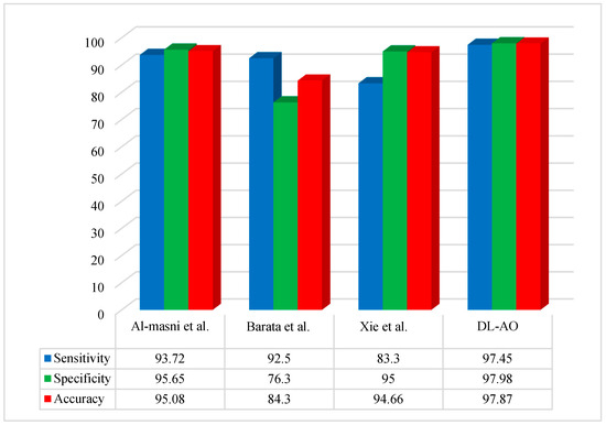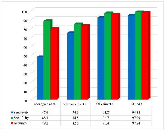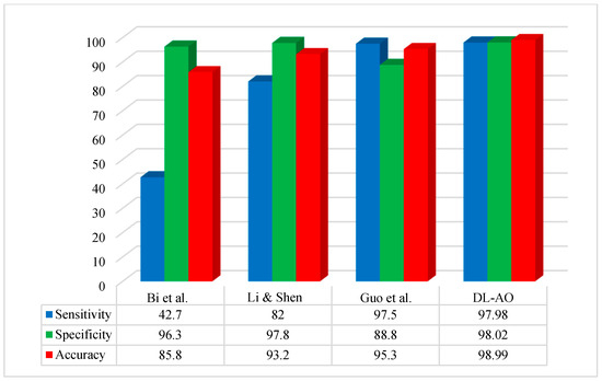 The proposed DL-AO method was evaluated against leading approaches, including Bi et al. [47], Li & Shen [46], and Guo et al. [45], demonstrating its superior performance across sensitivity, specificity, and accuracy metrics. DL-AO achieved an impressive sensitivity of 97.98%, specificity of 98.02%, and accuracy of 98.99%, surpassing all competing methods. In comparison, Bi et al. [47] recorded 42.7% sensitivity, 96.3% specificity, and 85.8% accuracy, reflecting a significant gap in performance. Li & Shen [46] showed improved results with 82% sensitivity, 97.8% specificity, and 93.2% accuracy. Guo et al. [45] performed well with 97.5% sensitivity, 88.8% specificity, and 95.3% accuracy but fell short of the DL-AO results. These outcomes underscore the efficacy of DL-AO in delivering high precision and reliability for accurate classification and diagnosis tasks.