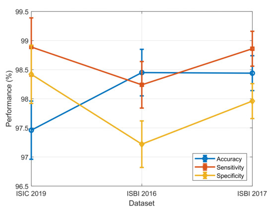 We have drawn error bars for accuracy, sensitivity, and specificity across datasets (ISIC 2019, ISBI 2016, ISBI 2017) in a way that reflects variability and confidence intervals.