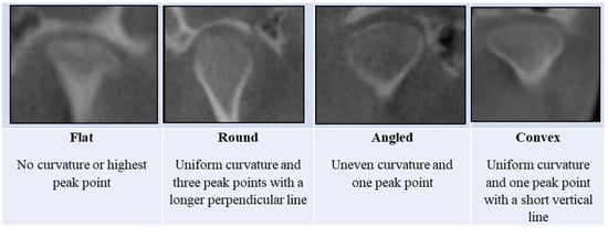 The proposed CBCT classification for the mandibular condylar shape is shown in Figure 1—this includes the following condyle, with no curvature or highest peak, which was considered a flat condyle; three peak points with a longer perpendicular line on a uniform curvature was classified as a rounded condyle; a condyle with uneven curvature and one peak point was classified as an angled condyle; and a convex condyle was classified as when the condyle had uniform curvature and one peak point with a short vertical line.