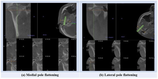 The flattening of the medial pole was present in the left condyle in 33.3% of cases, while for the right condyle, flattening of the medial pole was present in 39.3% of cases (Table 1, Figure 2).