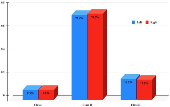 Figure 3 shows that Class II had the highest degenerative changes followed by Class III and Class I, respectively.