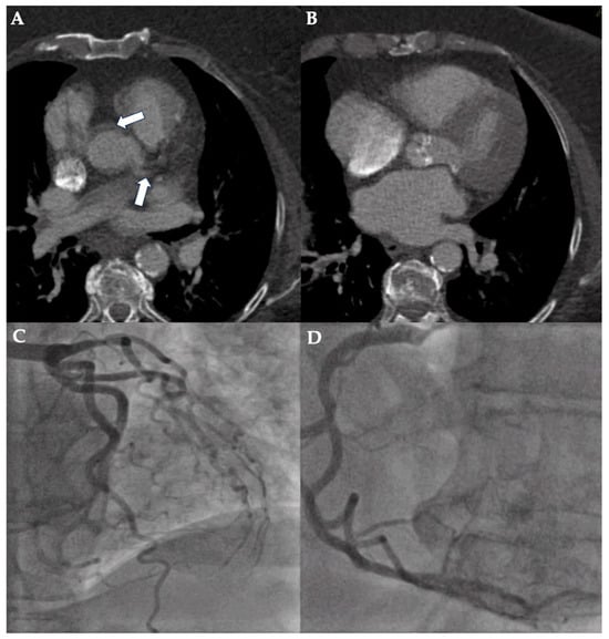 Case example of a false-positive assessment of pre-TAVI-CT. CT planning for TAVI of a 74-year-old woman with body mass index of 43.9 kg/m2 was performed using first-generation dual-source CT. Poor image quality (non-diagnostic; 5-point Likert scale rating: 1) due to the combination of excess quantum mottle, stairstep artifact (white arrows show double contour of aorta and left main coronary artery), and suboptimal coronary artery contrast is illustrated in axial image views (A,B). However, ICA excluded relevant coronary artery disease of the left (C) and right coronary artery (D).