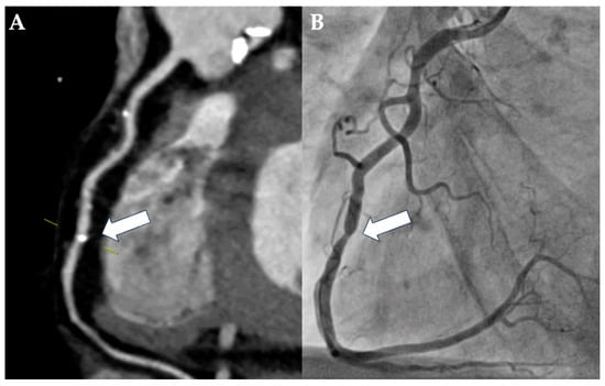 Case example of a rare false-negative assessment of pre-TAVI-CT. A 58-year-old man with severe AS was evaluated for TAVI due to hostile chest and chronic obstructive pulmonary disease with long-term oxygen therapy. Imaging was performed using first-generation dual-source CT and was of good quality despite minor streak artifacts arising from contrast material in the right ventricle. Based on the vessel view of the right coronary artery (A), the localized calcification of the mid segment was assessed as being mild (25–49% luminal diameter stenosis; CAD-RADS 2; white arrow). However, ICA revealed a severe, ca. 80% luminal diameter stenosis of the corresponding lesion in the mid-segment of the right coronary artery ((B); white arrow).